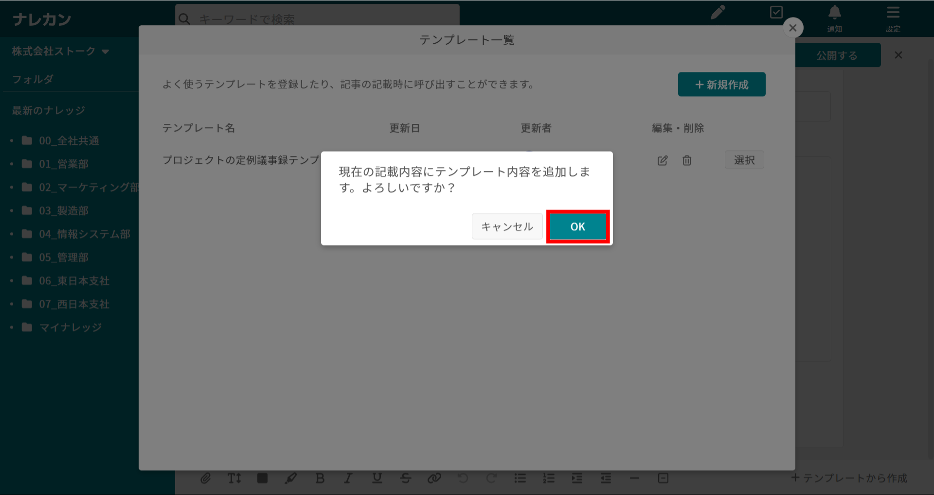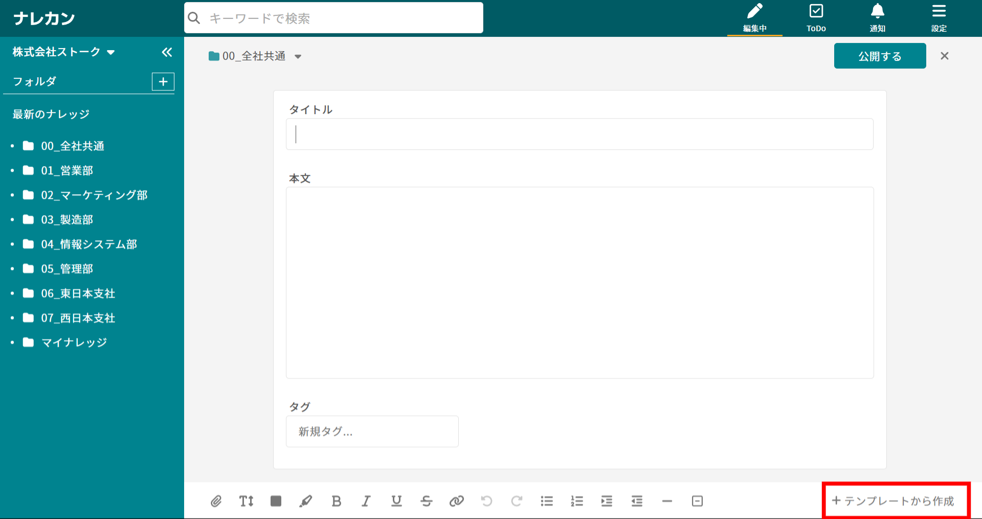 テンプレート機能を使えば、定型の記載内容を、ボタン1つで呼び起こすことができます。