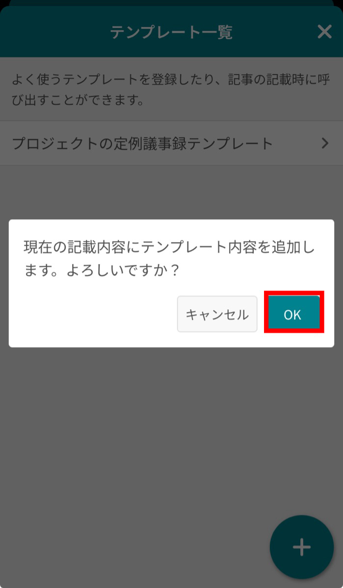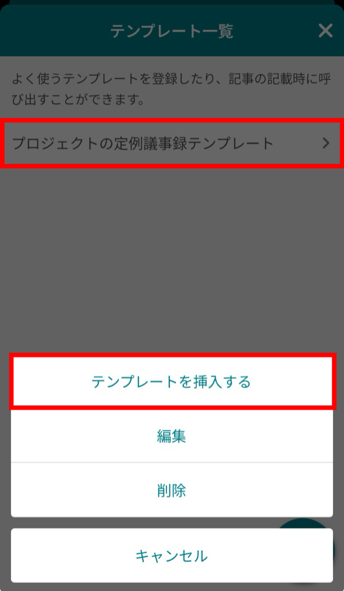 ①呼び出したいテンプレートをタップし、「テンプレートを挿入する」を選択します。