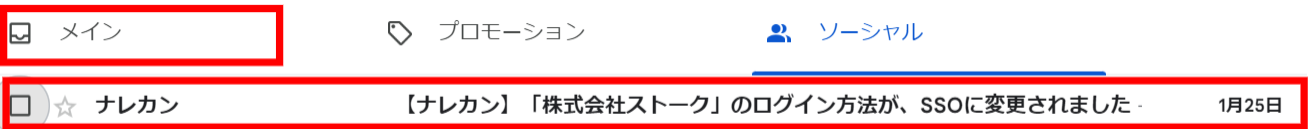 1)万が一、「プロモーション」や「ソーシャル」に振り分けられていた場合は、ドラッグ&ドロップで「メイン」に振り分けられるよう設定してください。