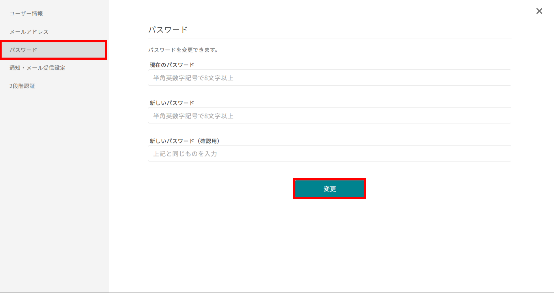 ②「パスワード」より、「現在のパスワード」「新しいパスワード」を入力し、「変更」ボタンをクリックします。