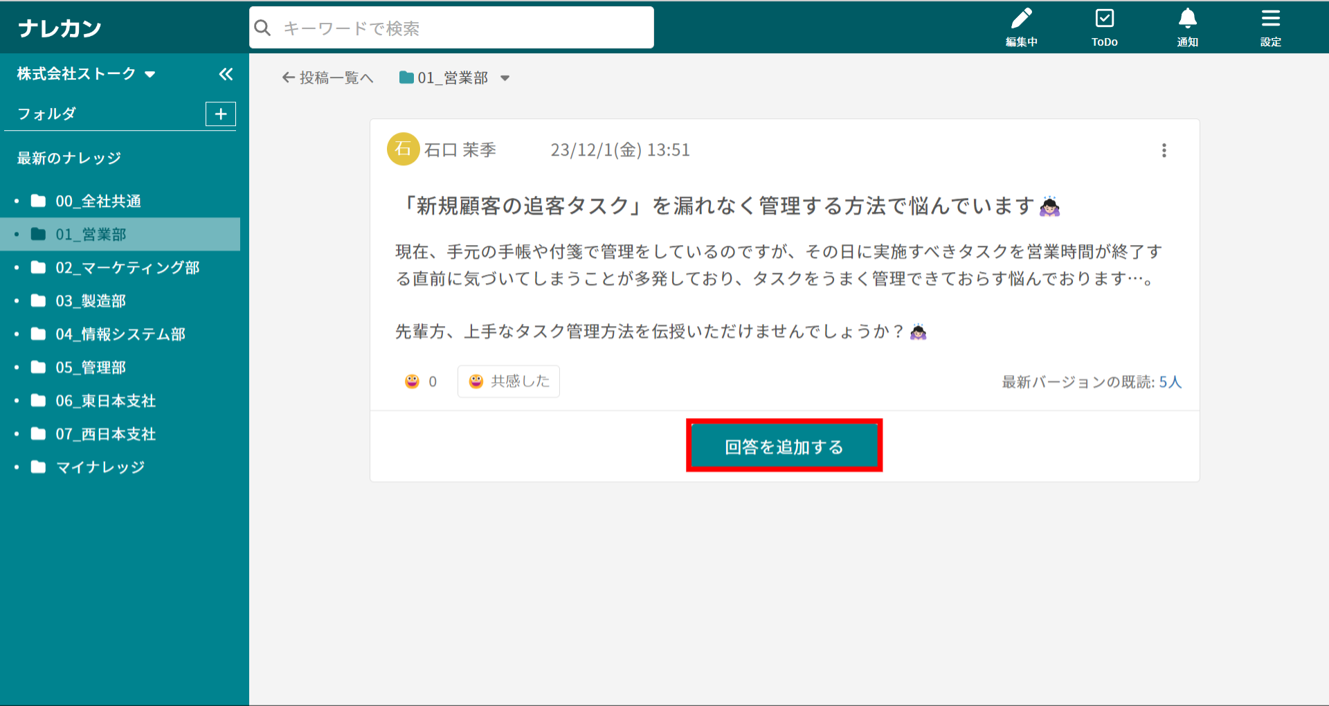 ①回答をしたい質問の画面から、「回答を追加する」をクリックします。