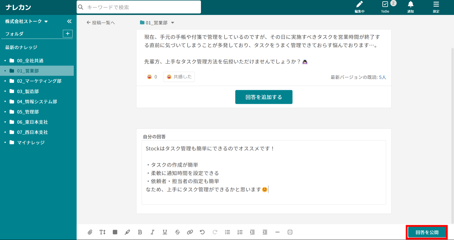 ②自分の回答欄に回答を入力し、「回答を公開」をクリックします。