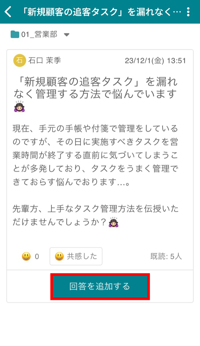 ①回答をしたい質問の画面から、「回答を追加する」をタップします。