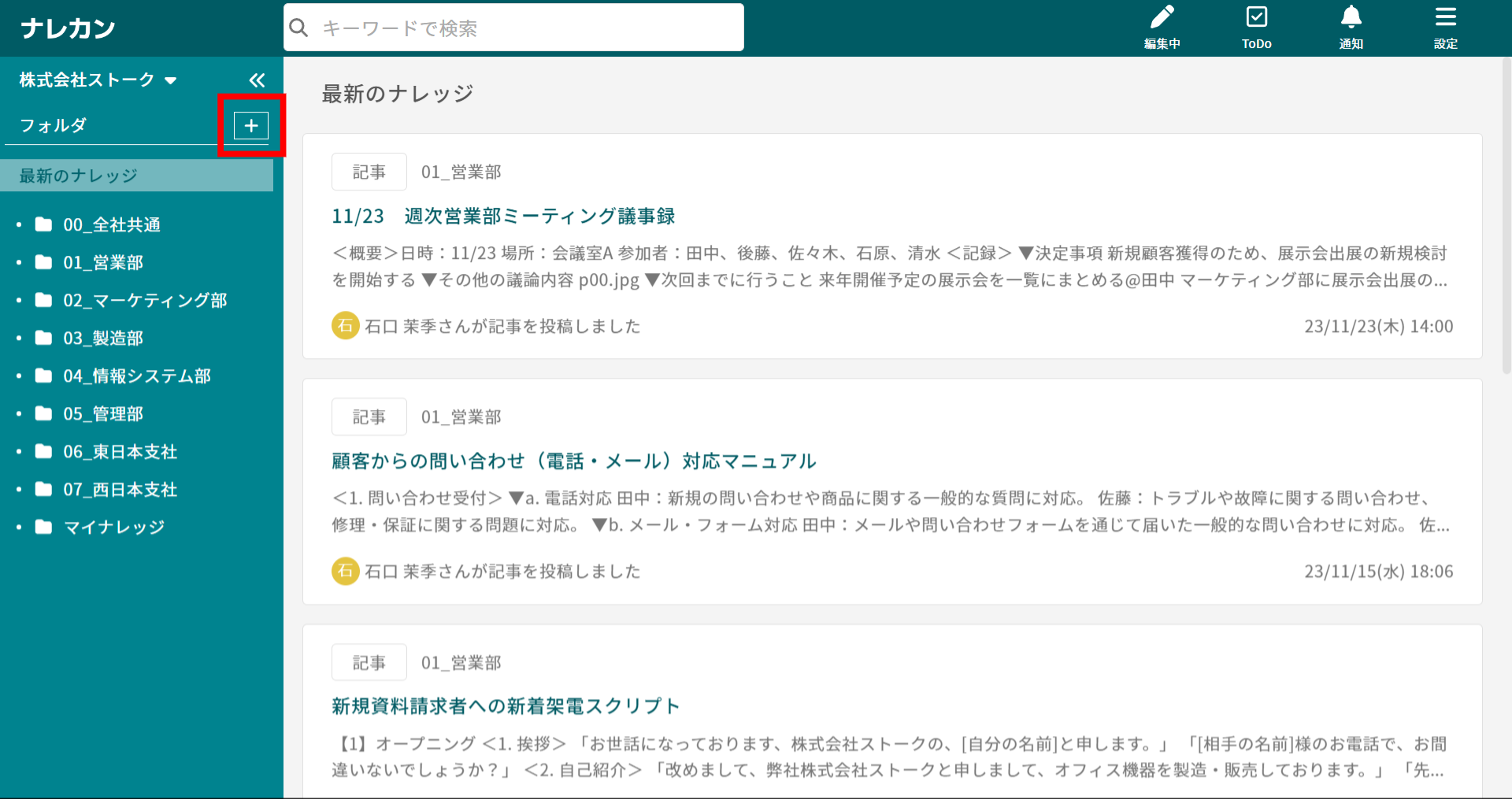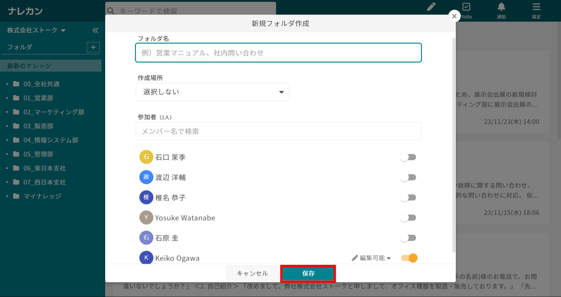②「フォルダ名」「参加者」を入力し、必要があれば「作成場所」も選択し、「保存」をクリックします。