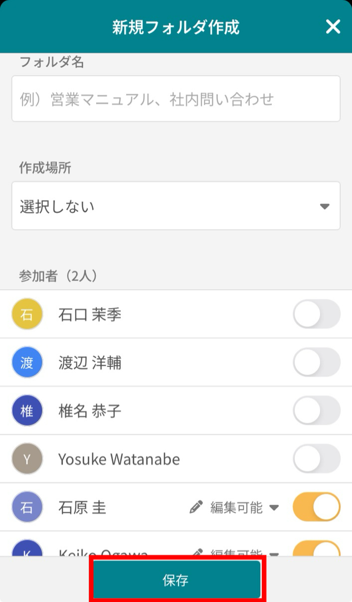 ②「フォルダ名」「参加者」を入力し、必要があれば「作成場所」も選択し、「保存」をタップします。