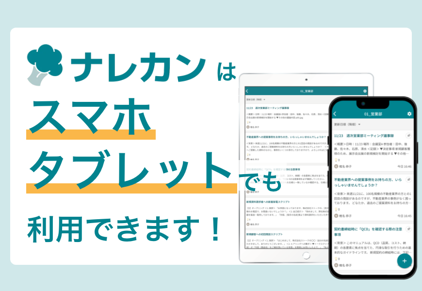 - 【ナレッジの一元化】 ナレカン内のナレッジは最新でフレッシュな状態で管理。